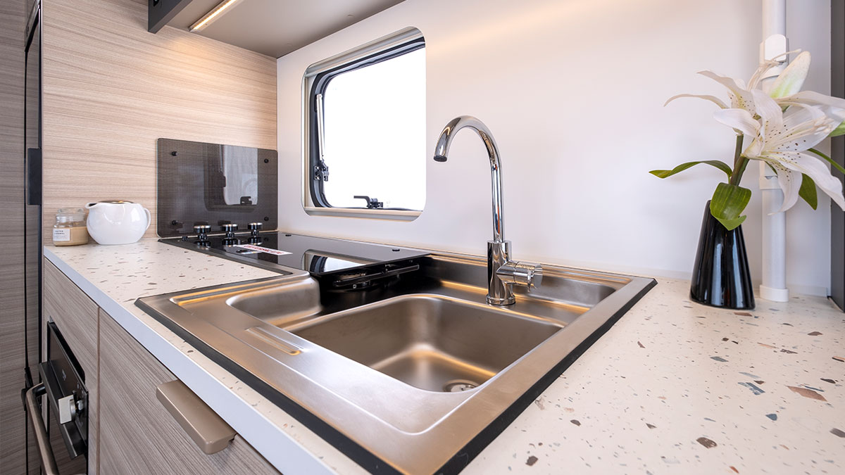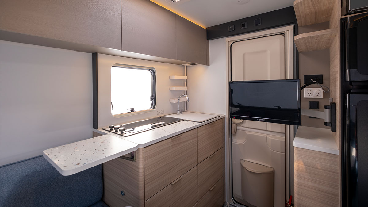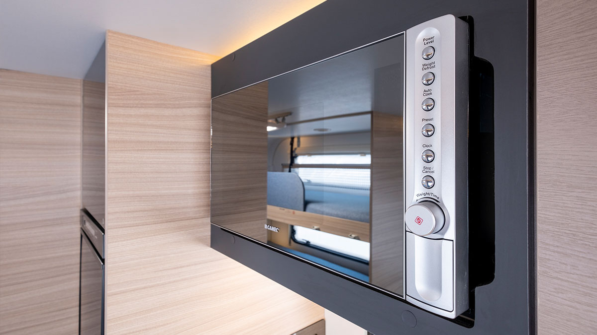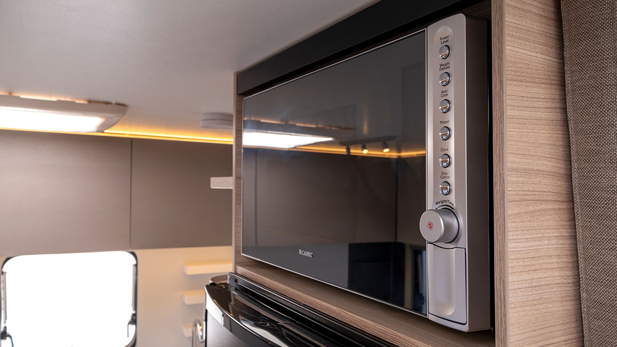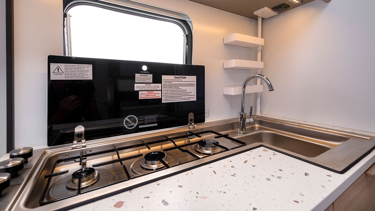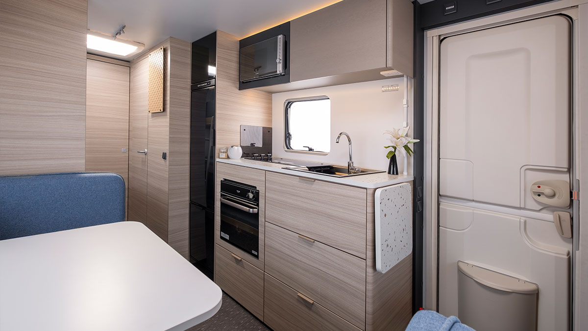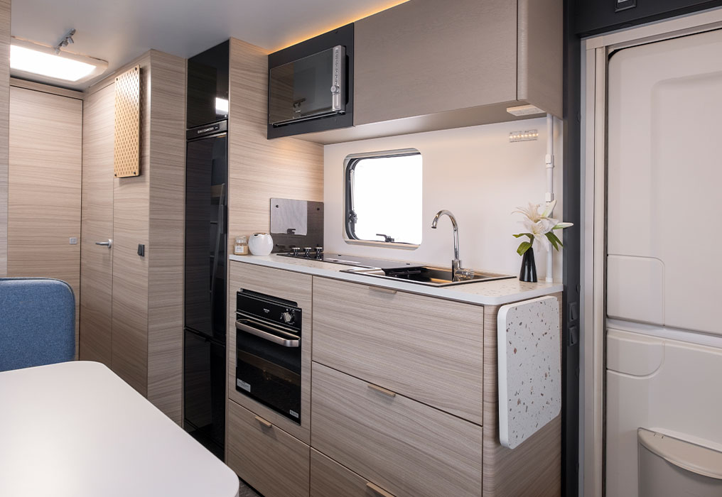The Adria Altea 402 PH sport includes a three-burner cooktop, fridge/freezer and microwave. The Adria Altea 552 PK sport has the same setup with the addition of an oven/grill.
