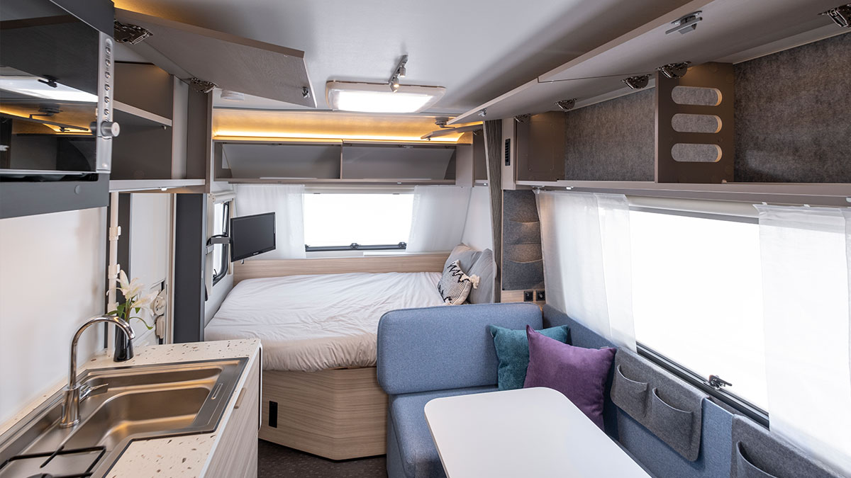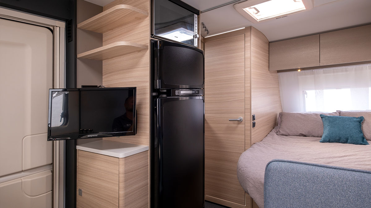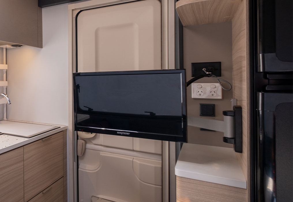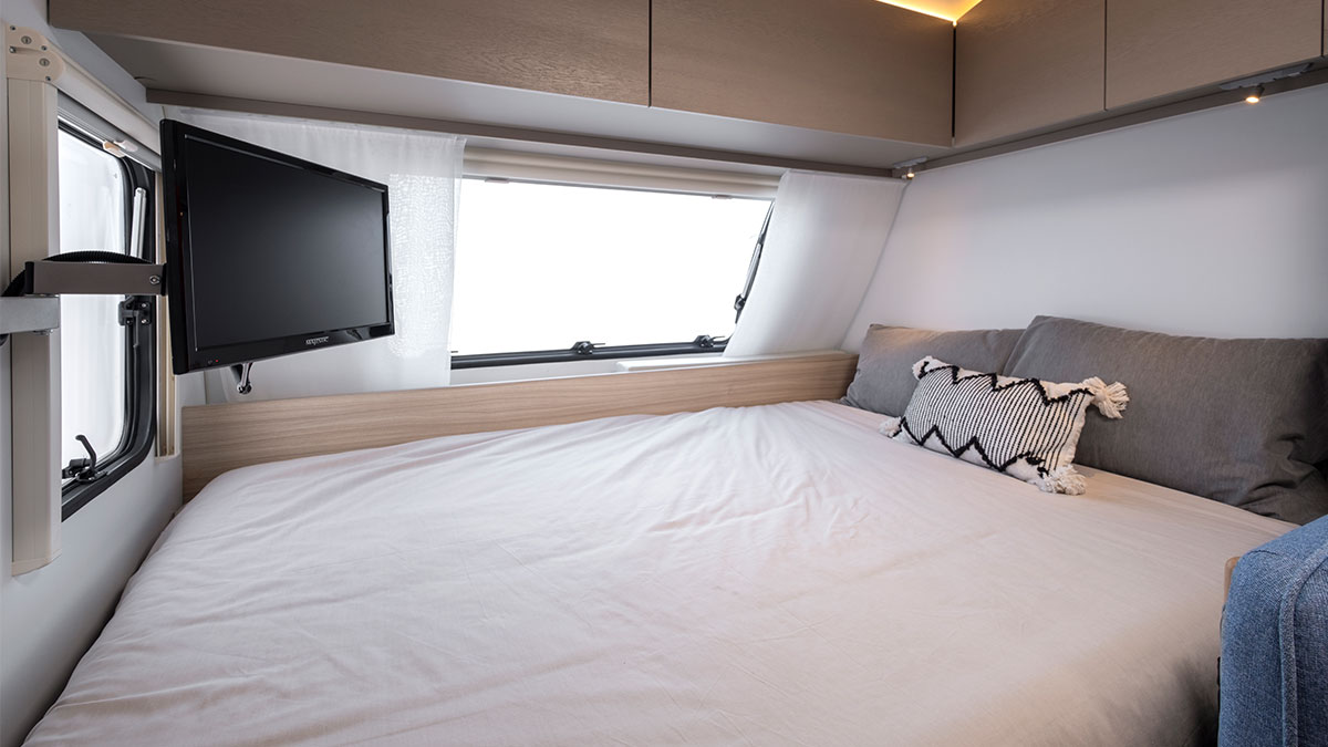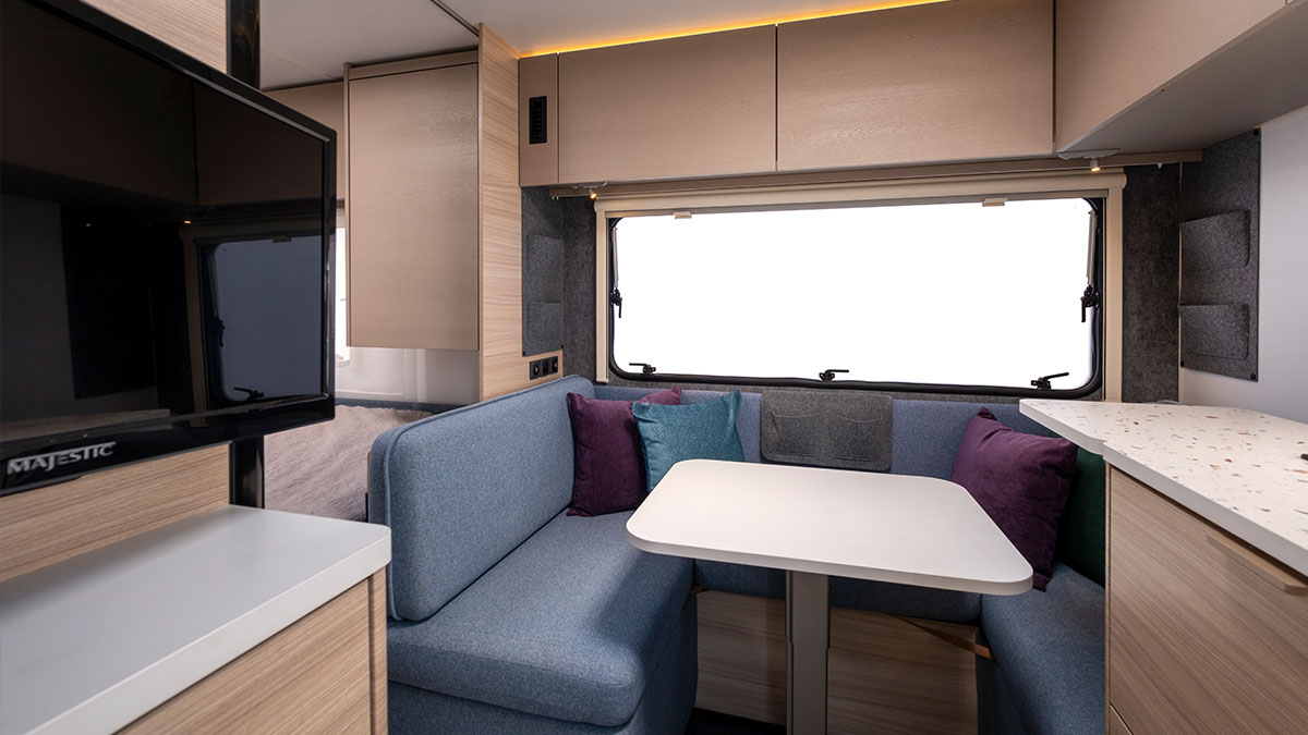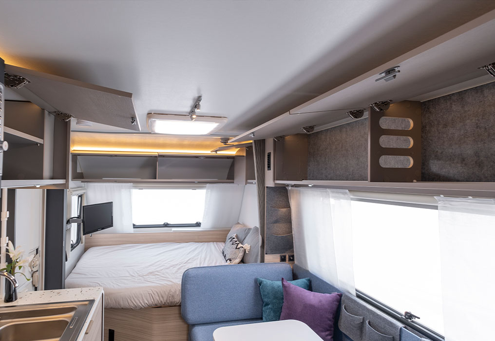 The Adria caravan features a digital control panel, multimedia solutions with a TV point and bracket, ample storage, and conveniently placed USB ports for charging and connectivity throughout the van