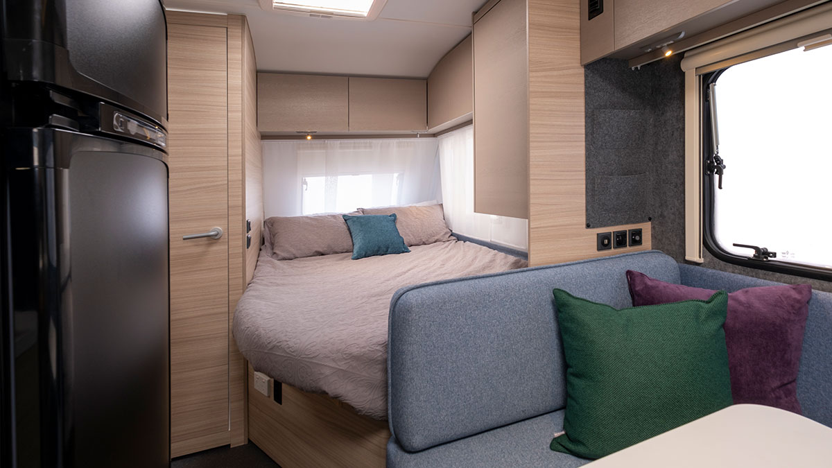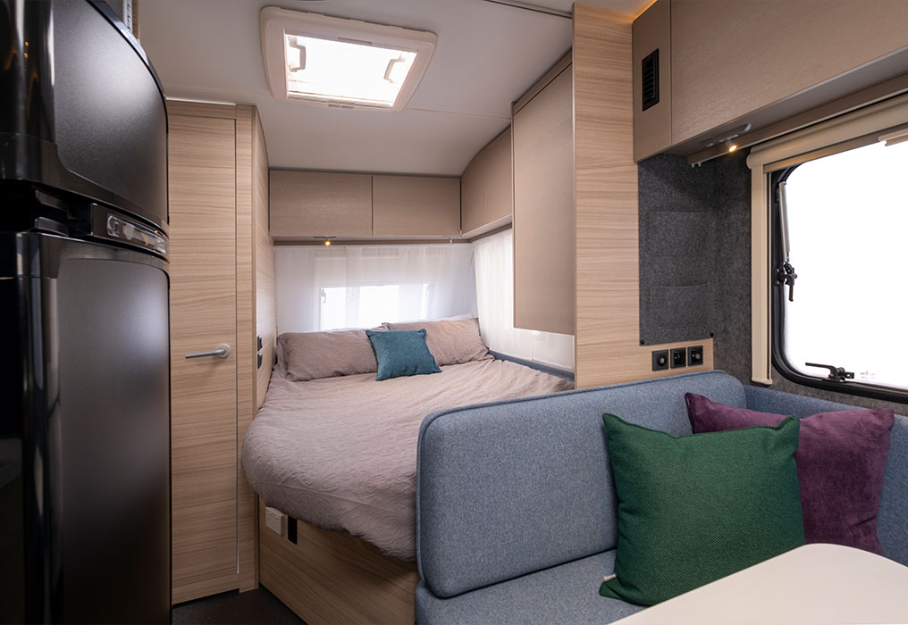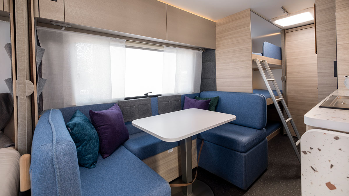 The Adria Altea 402 PH Sport has a permanent double bed and rear convertible dinette for two, while the 552 PK Sport adds three bunks alongside a permanent double bed and dinette conversion.