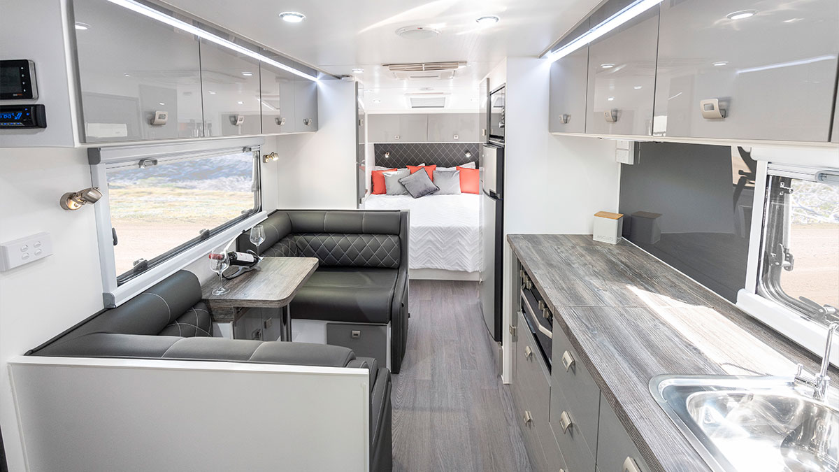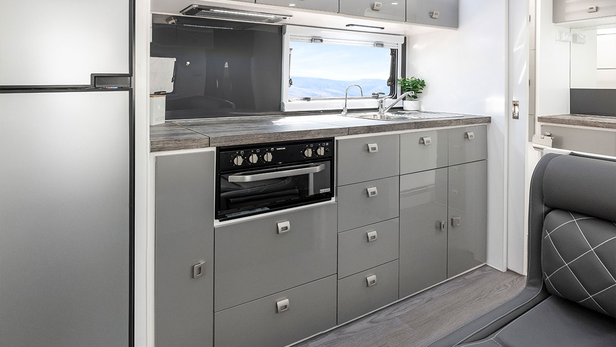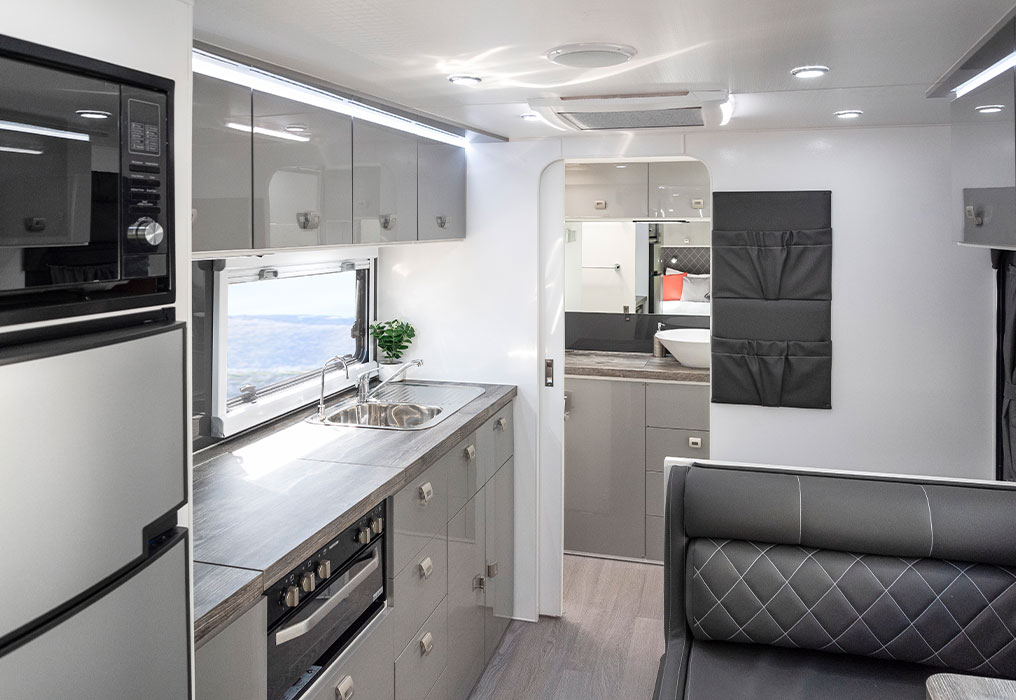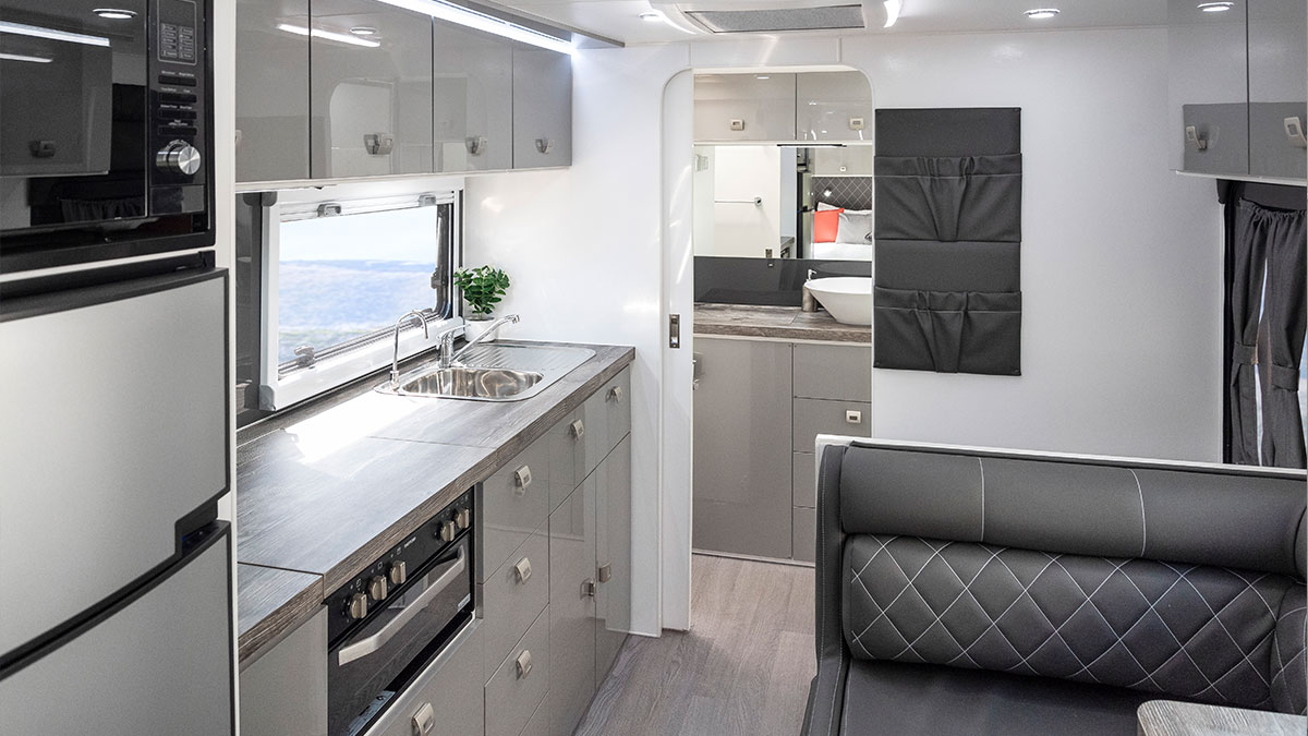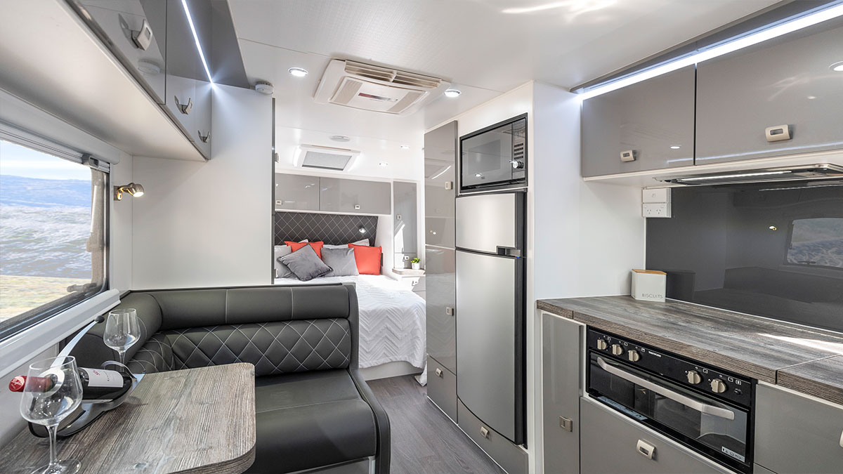The kitchen features premium appliances, including a gas hotplate with a griller, a compressor fridge/freezer, and a microwave. Plus, most models have 12 V fans and reverse-cycle air conditioning for year-round comfort.