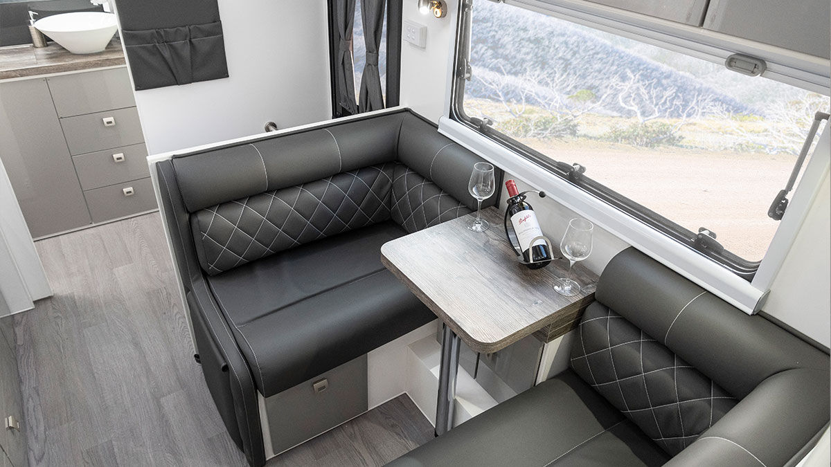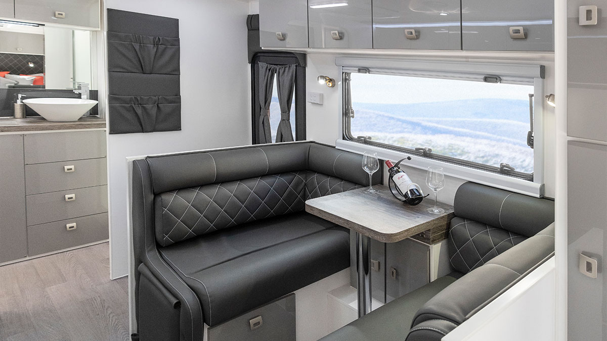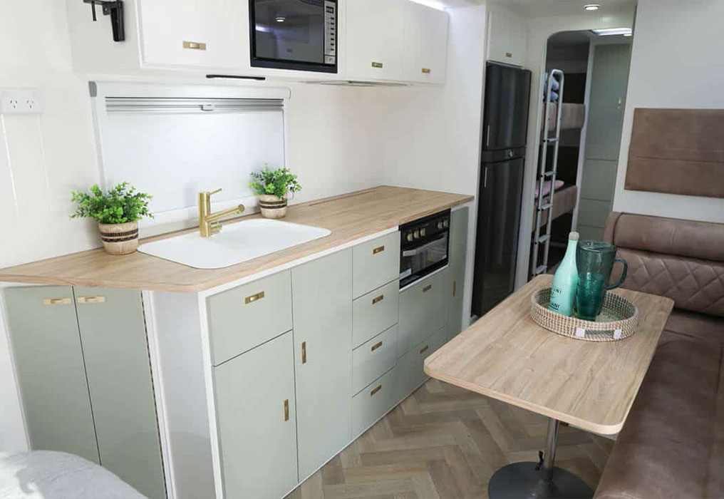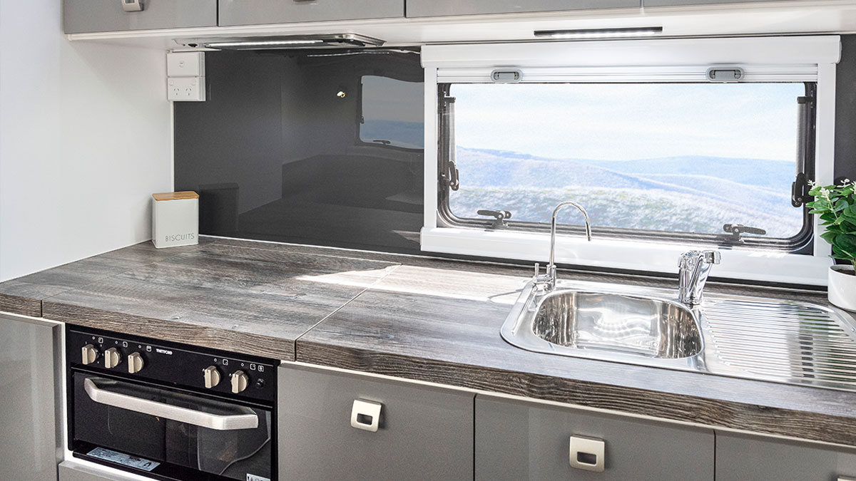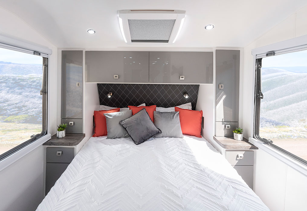 The kitchen features premium appliances, including a gas hotplate with a griller, a compressor fridge/freezer, and a microwave. Plus, most models have 12 V fans and reverse-cycle air conditioning for year-round comfort.