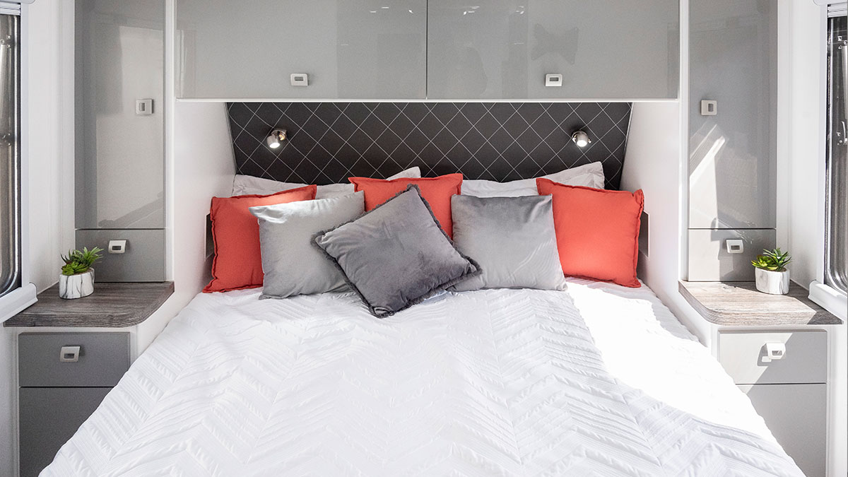 The CRX offers flexible bedding with fixed queen or single beds, convertible dinettes, and bunk options, accommodating 2–6 berths while maximising comfort, space, and versatility for families or couples.