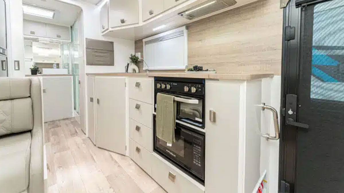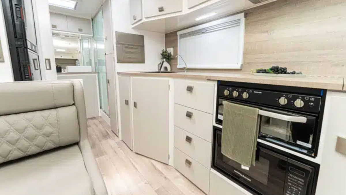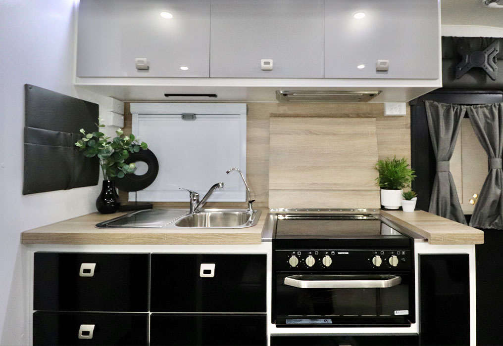 The kitchen features a recessed cooktop with a lid over the stove, a range hood, a compressor fridge, a microwave, and four hotplates with a griller, making cooking convenient and efficient while you’re on the road.