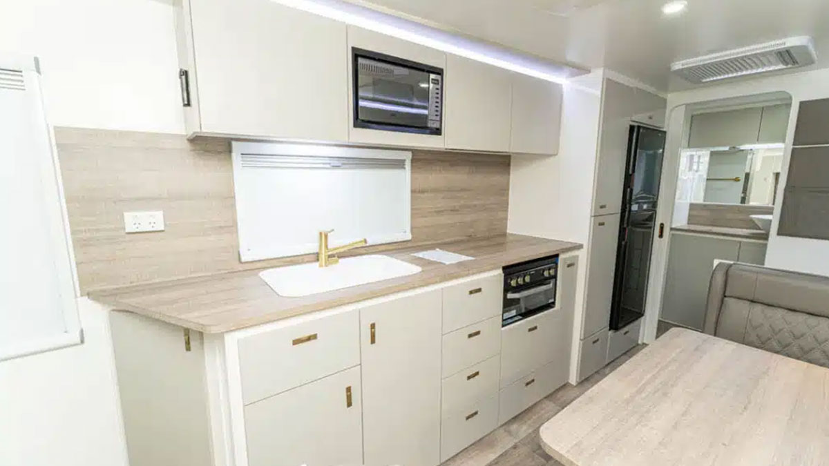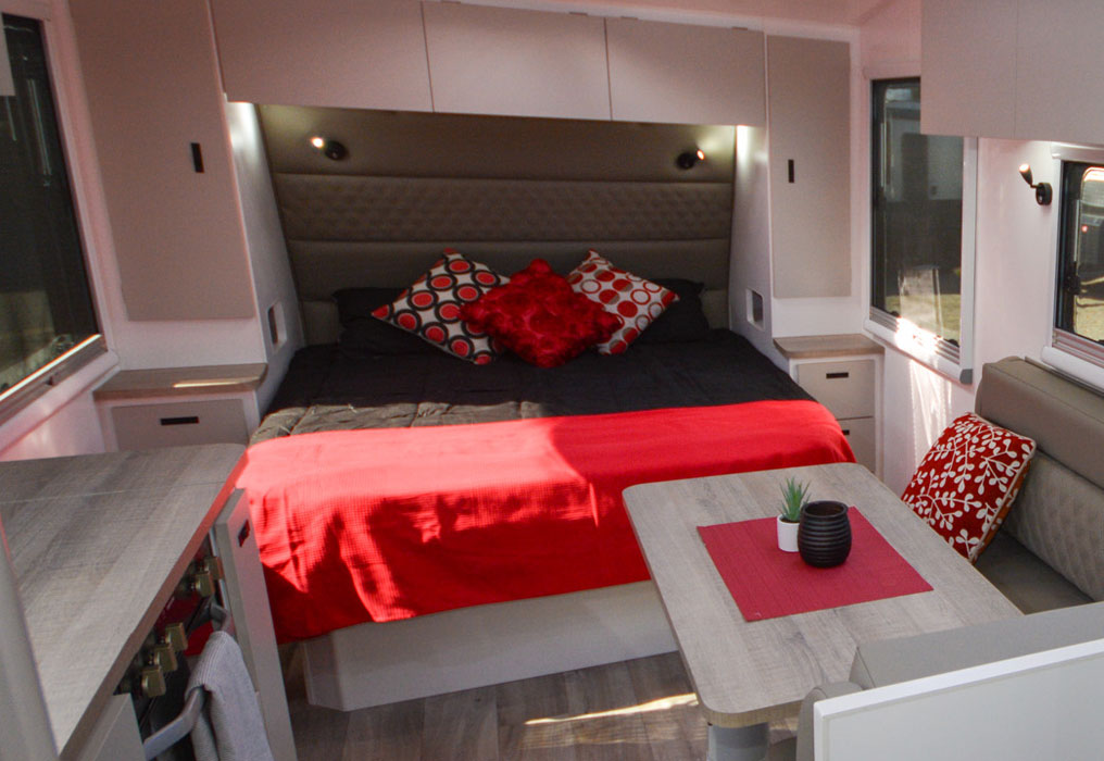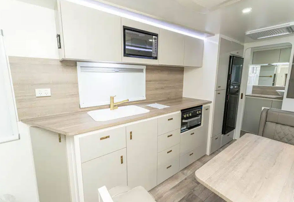 All Design RV Odyssey models come with a comfortable Queen bed featuring handy under-bed storage for extra gear. Many layouts also include bunk options, making these caravans a flexible choice for families or couples who need extra sleeping space.