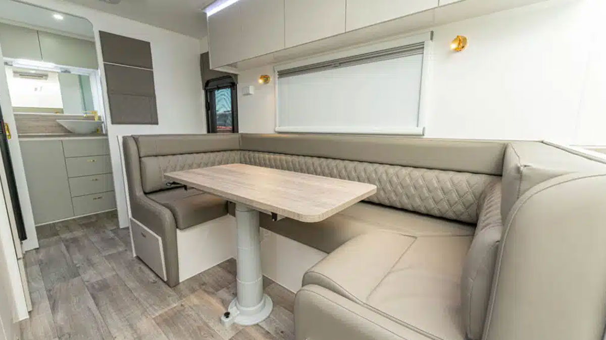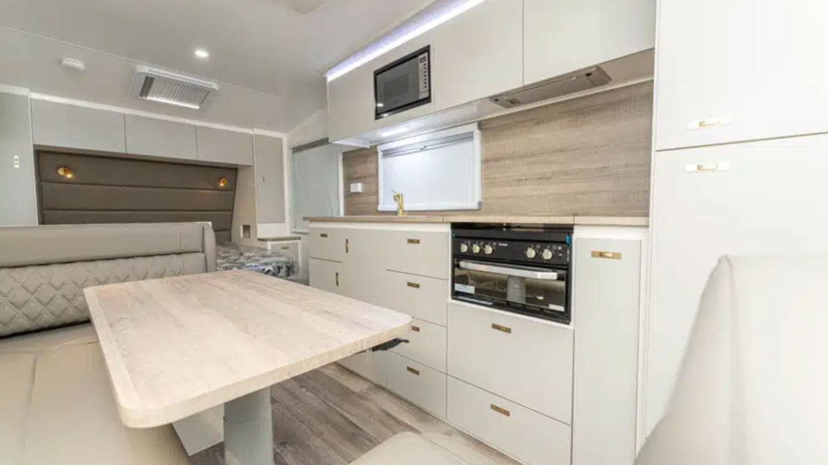 The kitchen features high-quality appliances, including a compressor fridge, gas hotplates with a griller, and a microwave. Every model features a lounge area, with some offering a lounge-to-dinette conversion for flexible living space.