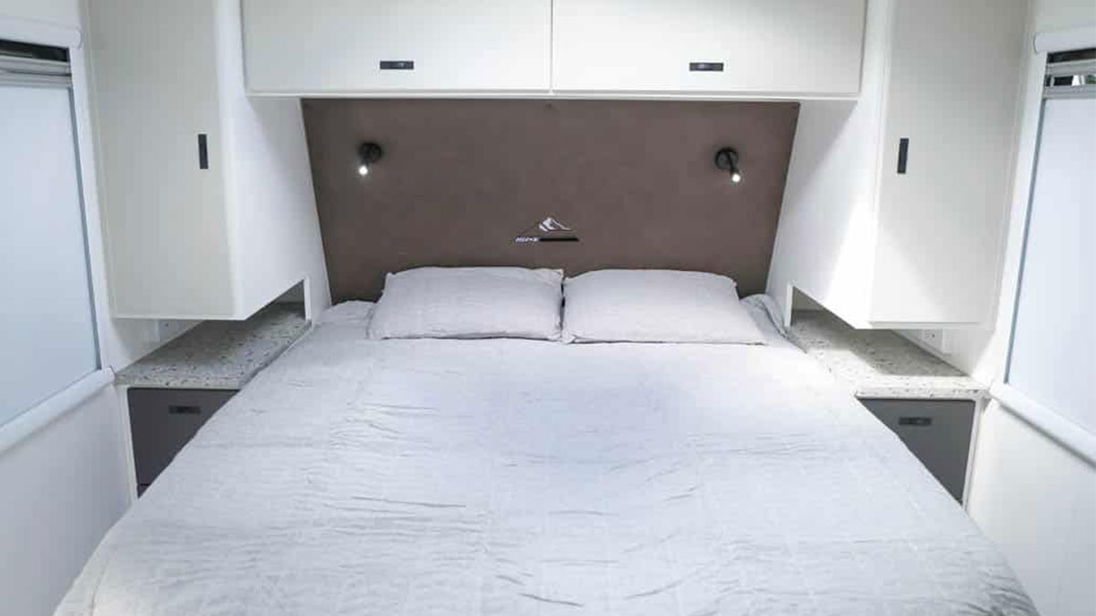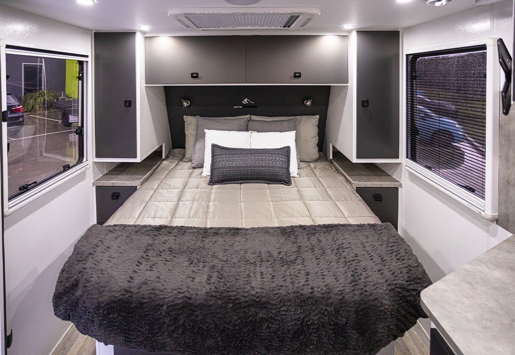 Enjoy ultimate convenience in the Stryker with its queen bed with an innerspring mattress, wardrobes on either side, and generous under-bed storage—perfect for keeping everything organised.