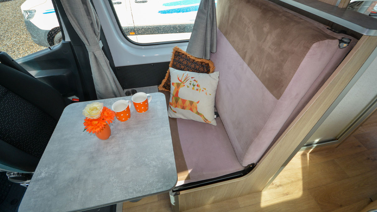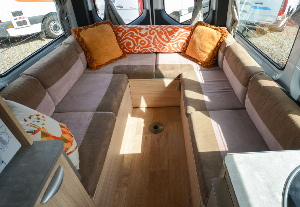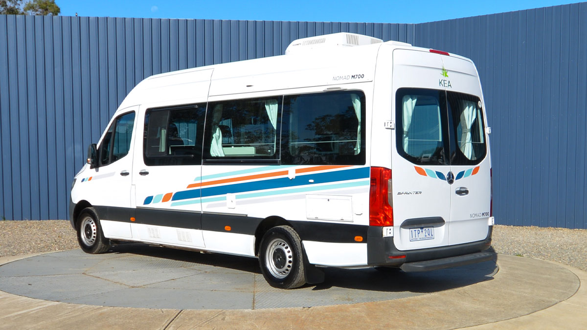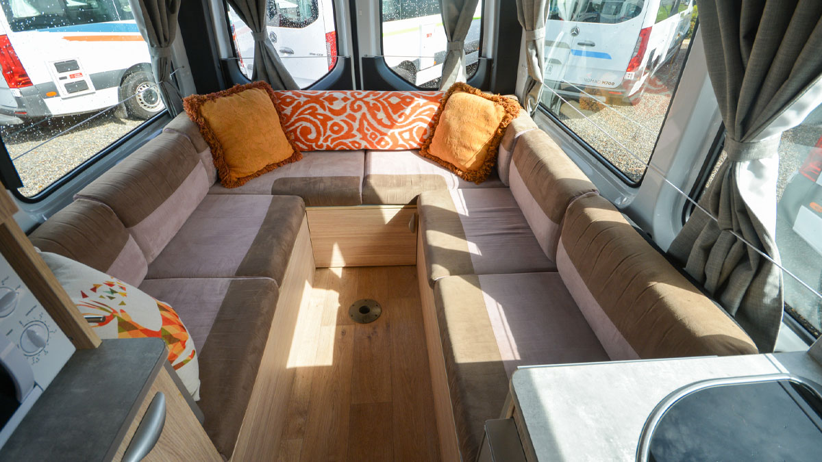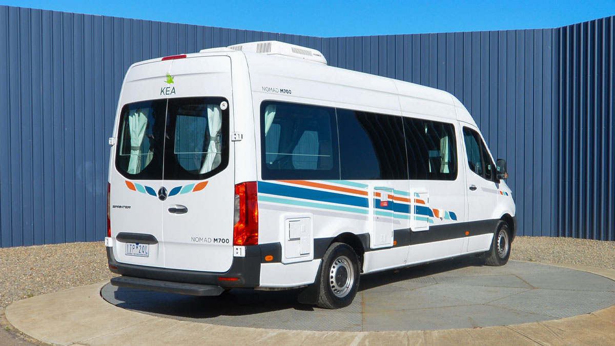 The KEA Nomad M700 features a large rear queen bed and a front dining area, with a clever mechanism that lets you fold out a spare single bed when needed.