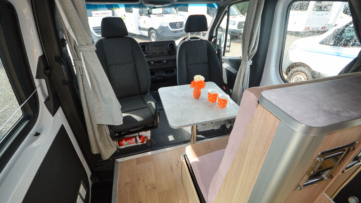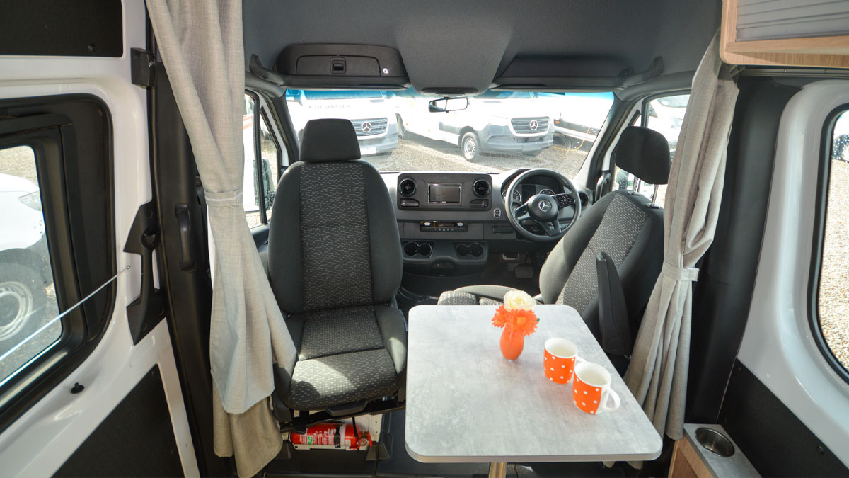 The KEA Nomad campervan is built on a reliable Mercedes-Benz Sprinter rear-wheel-drive chassis with a turbo-diesel engine. Classed as a 'certified self-contained vehicle', it's equipped for independent travel with water, toilet, and waste systems. It has three certified seats—with an extra seatbelt for a guest or child—plus two water tanks.