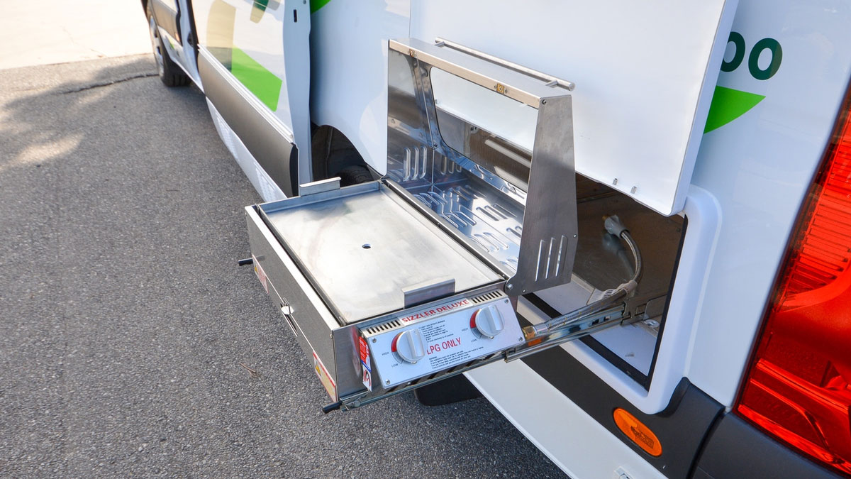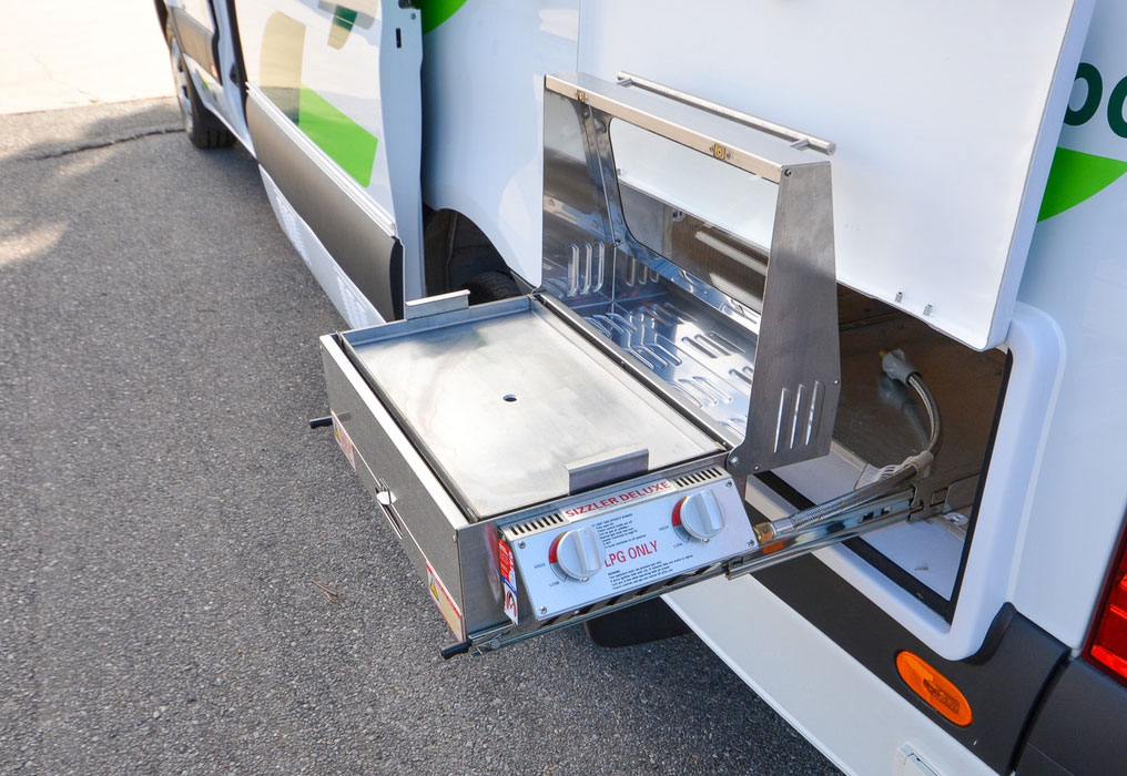 The external slide-out BBQ makes outdoor cooking in nature a breeze. Easily accessible, it lets you cook meals while enjoying the outdoors, and minimises the reliance on internal cooking facilities.