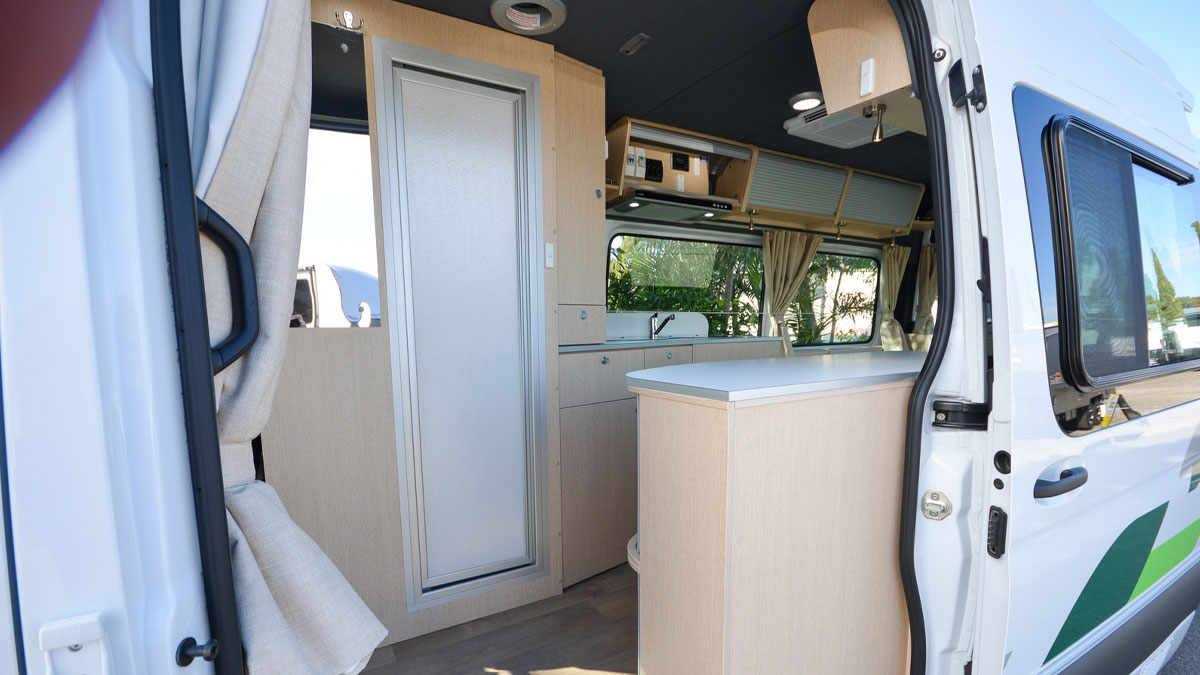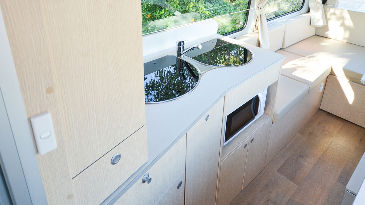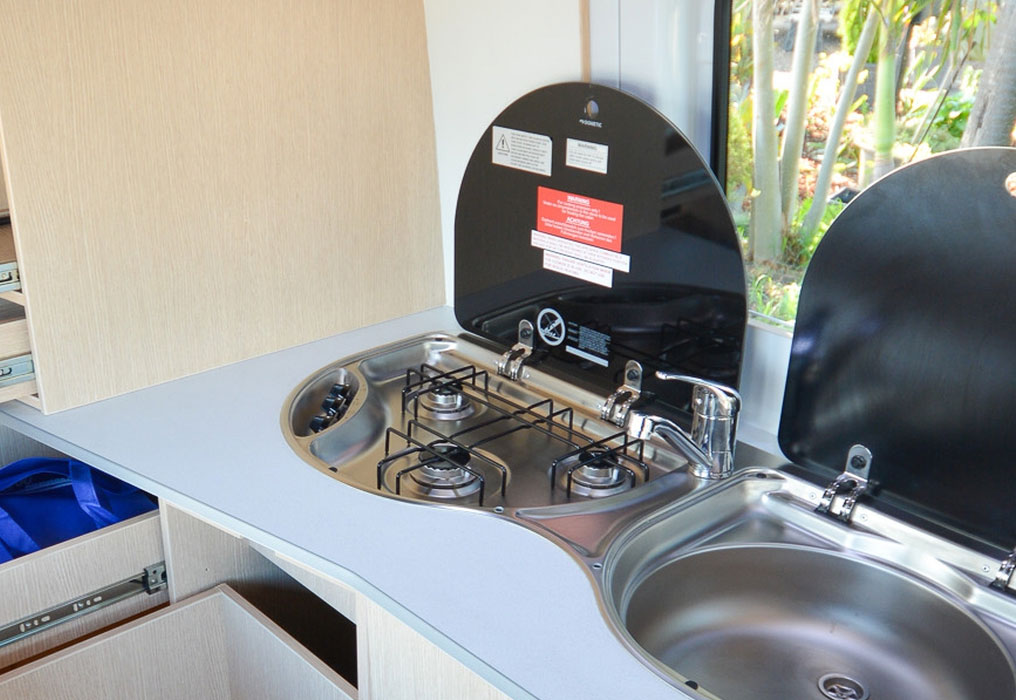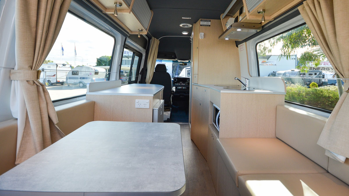The reverse-cycle heating and cooling system keeps the interior comfortable year-round. Warm up on chilly mornings or cool down when the temperature heats up, ensuring the perfect environment for relaxing, cooking, and sleeping on your travels.