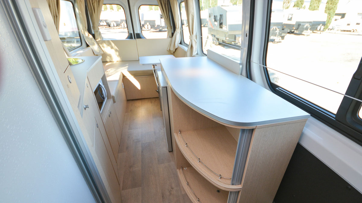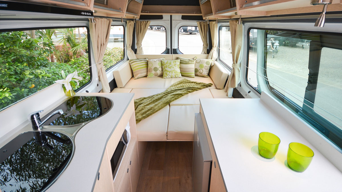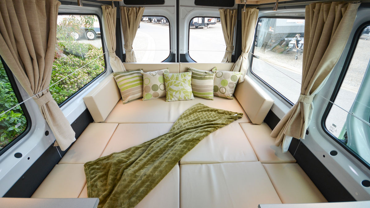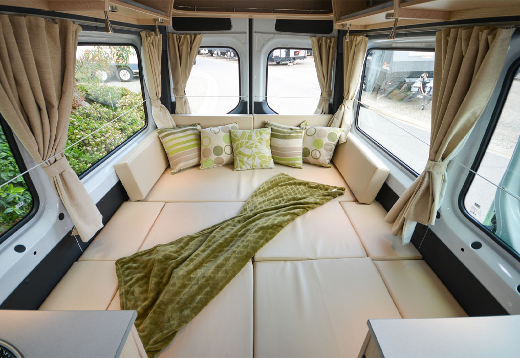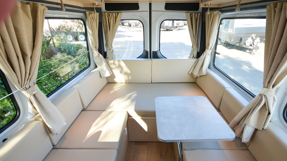 The large rear queen bed easily converts into two single beds. It also transforms into a U-shaped lounge/dining area, giving you the freedom to adapt the space to your travel needs and lifestyle.