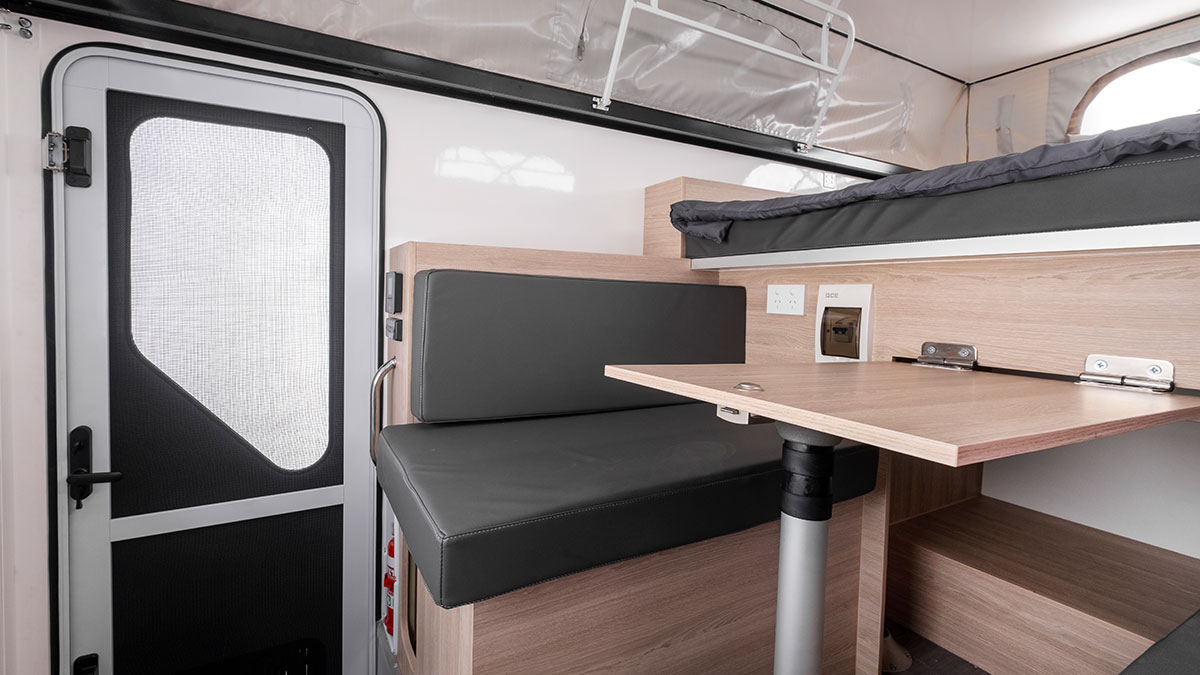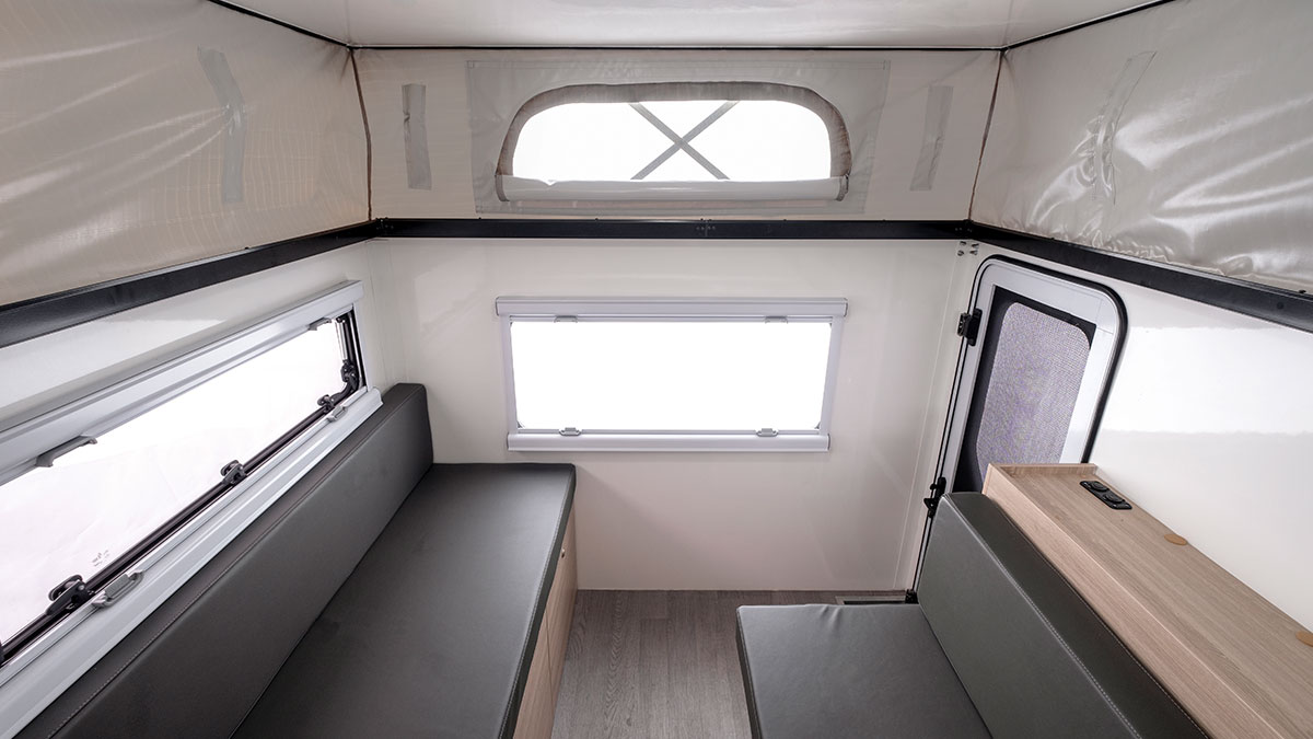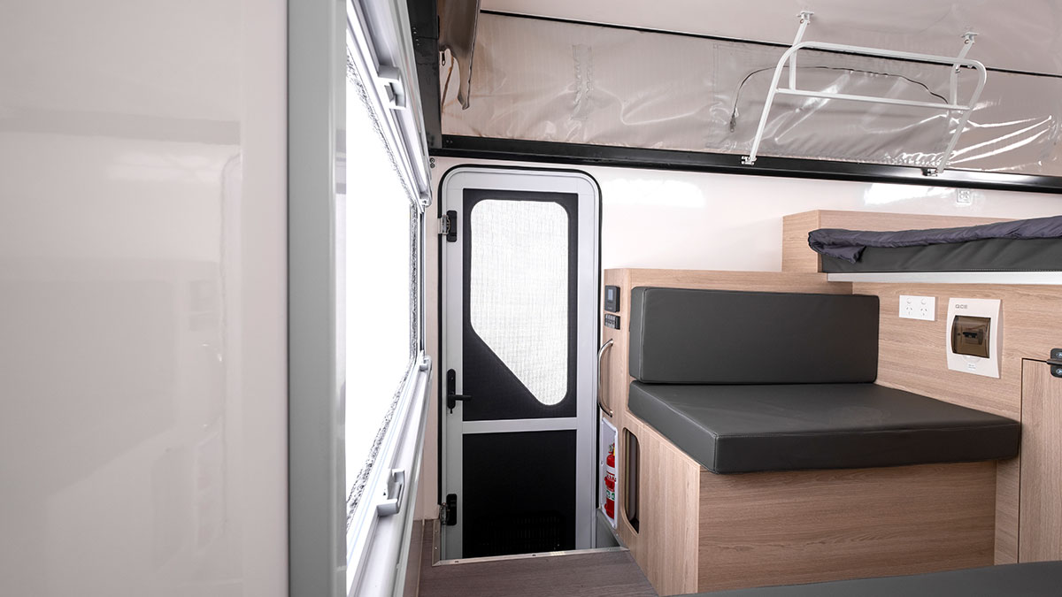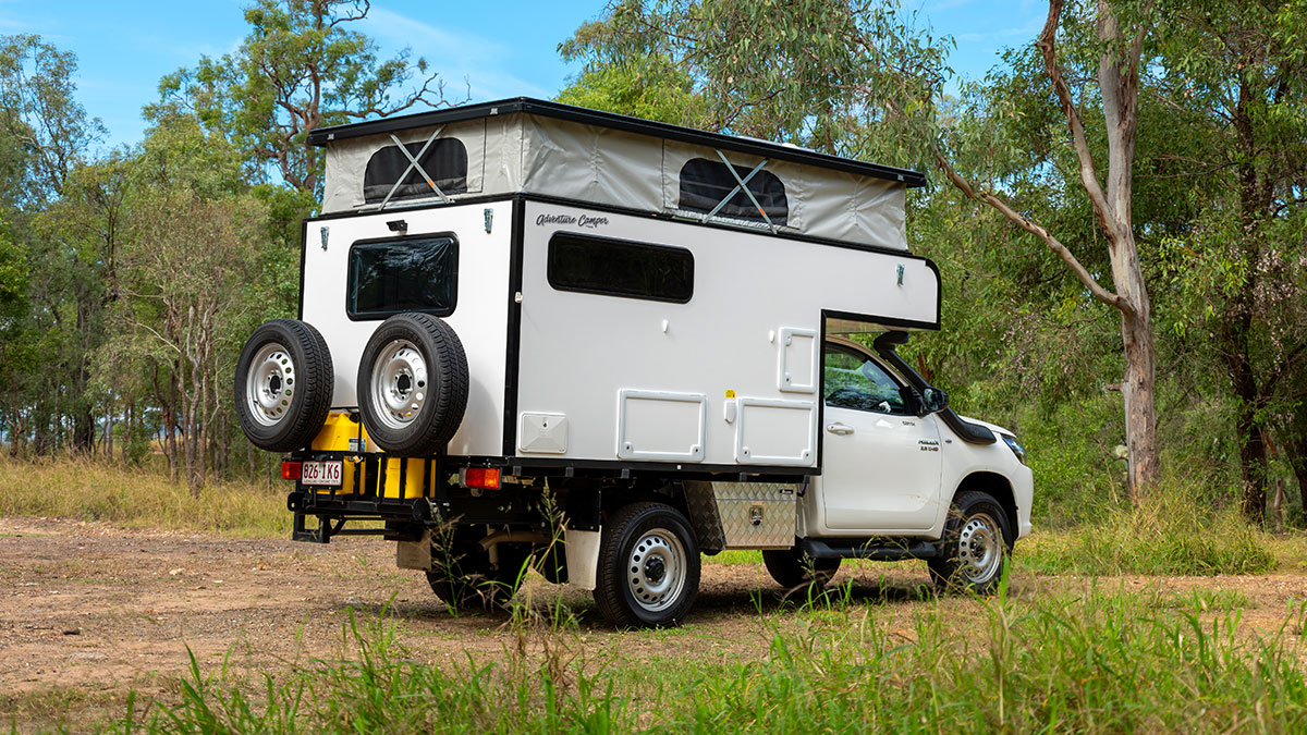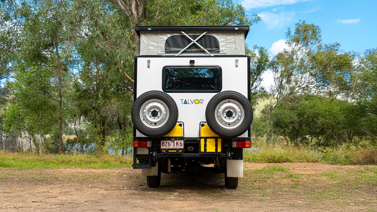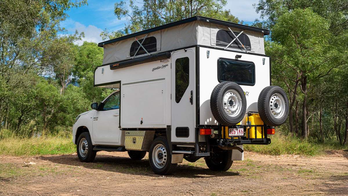 The Talvor 4WD adventure camper has a pop-top design with screened vents, is compact and efficient, provides ventilation, and is easy to store. Other features include a functional space with an over-cab bed, a compact dining and kitchen area, and reverse cycle air conditioning. Storage, a fridge/freezer, sink, and cooking facilities make meal prep easy, while the quality pop-top provides extra headroom and ventilation when it's popped!