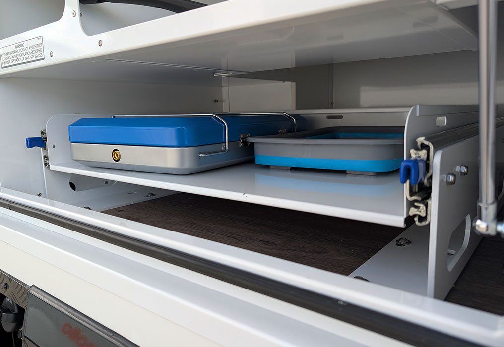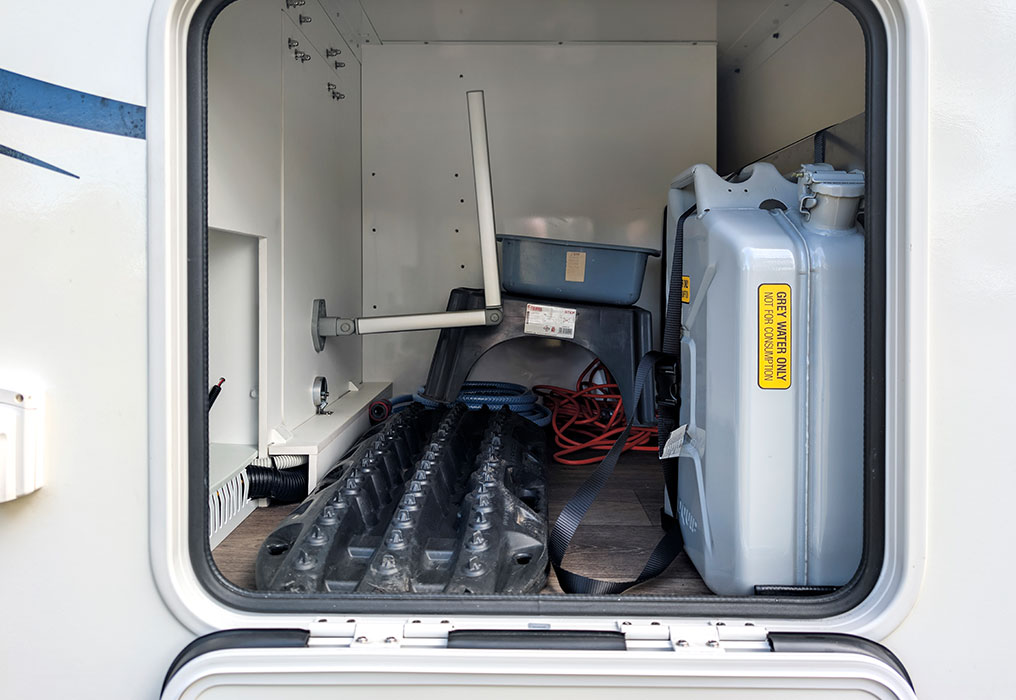 The vehicle can store 60 L of water—20 L under the sink and 2 x 20L in a dedicated external locker. In terms of diesel, it can store 2 x 20 L in the external locker.