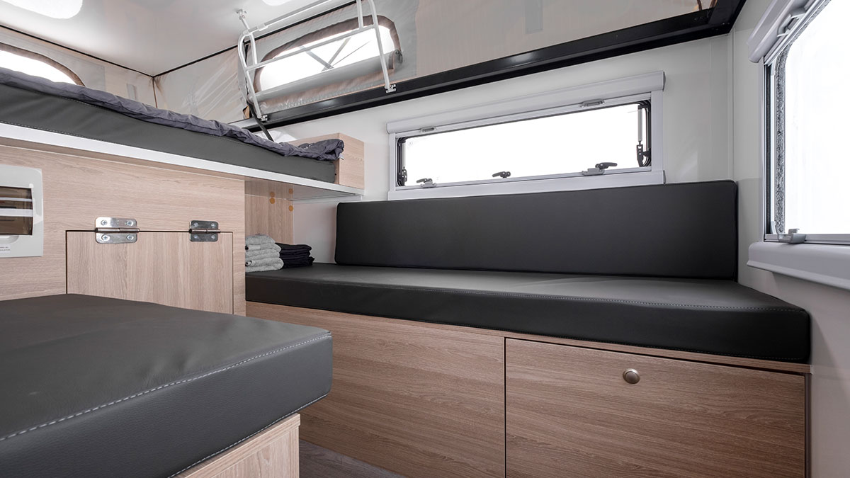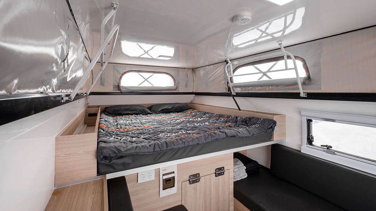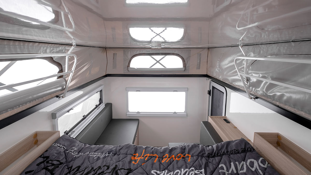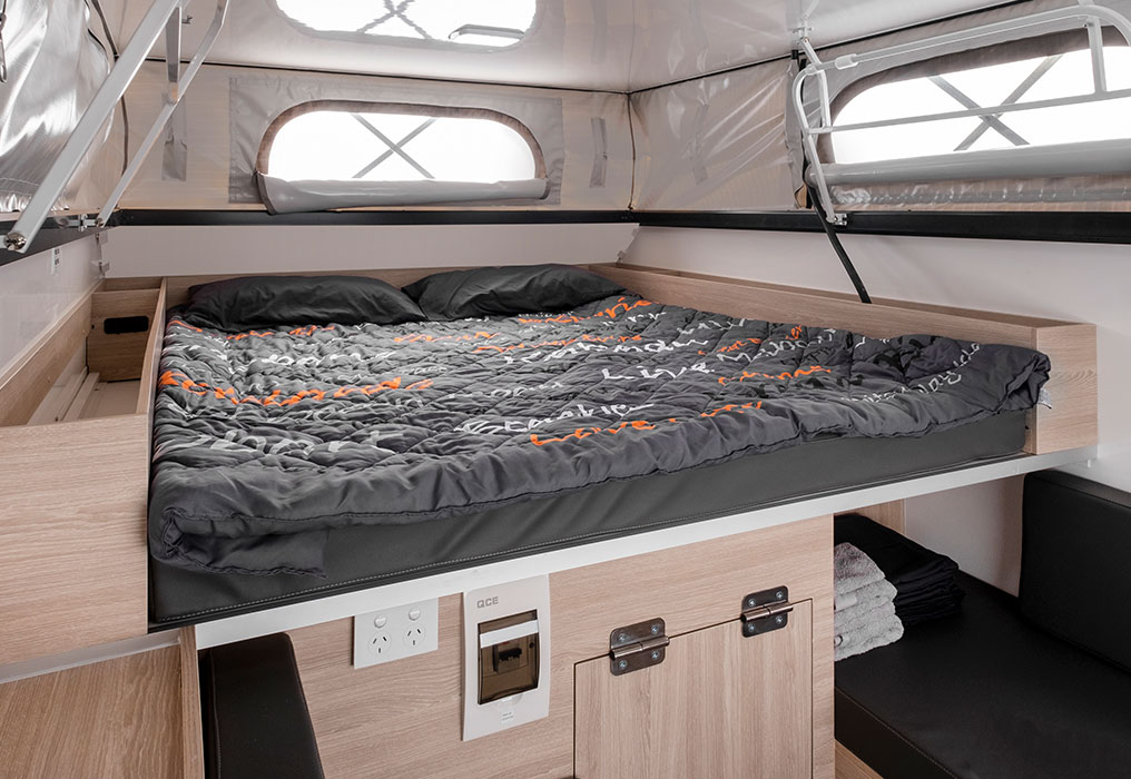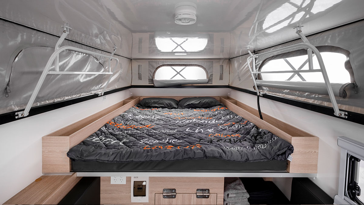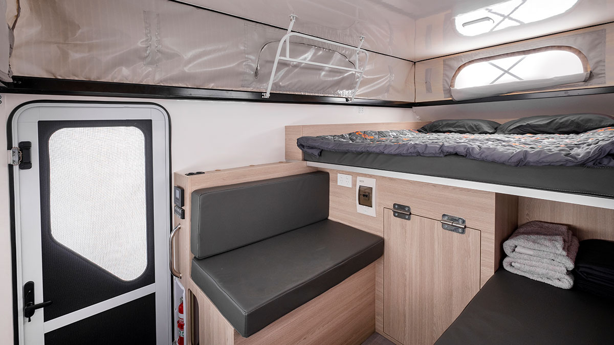 The Apollo 4WD adventure camper has a fixed queen-size 'luton' bed. 'Fixed' means it's not convertible, and 'luton' means it sits above the driver's cab—easy access for daytime naps and nightly slumber!