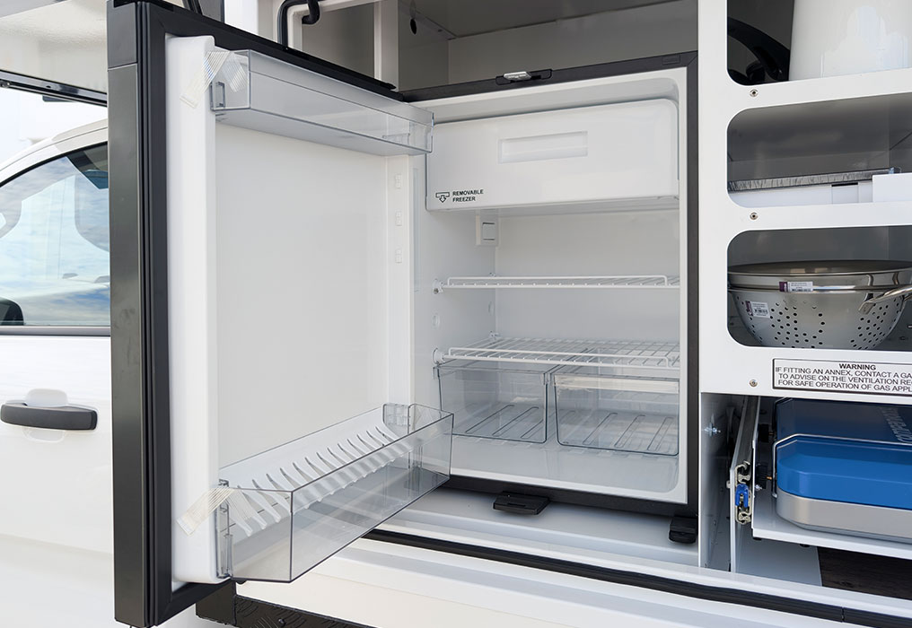 Interior kitchen features include a stainless steel sink with a 2-way flick mixer, 20 L fresh water capacity under the sink, and a 32 L removable fridge/freezer with a transit slide lock.