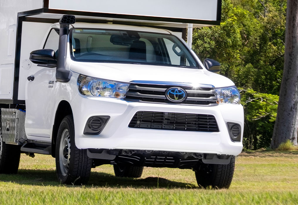 One of Australia's top-selling 4x4s, the Toyota Hilux Workmate has a 2.4L turbo-diesel engine, an 80L fuel tank, power steering, windows and mirrors, and an air-conditioned cabin.