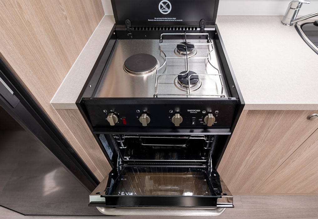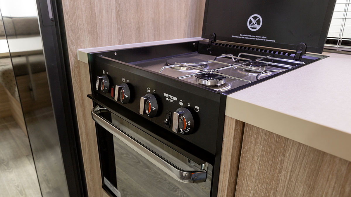 Prep and cook meals effortlessly in the well-appointed kitchen, which features a 100 L fridge/freezer, a 3-burner gas cooktop, a gas oven, a range hood, and a stainless steel sink.