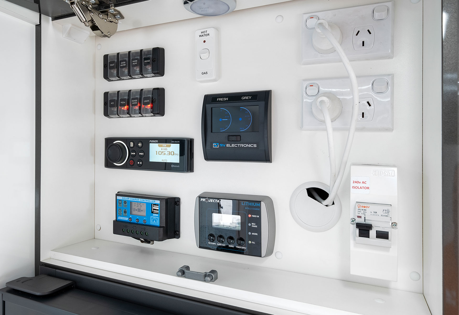 The internal kitchen features a versatile gas and electric stove with grill, a spacious fridge/freezer, a convenient microwave for quick meals, and a gas water heater for hot water on the go.