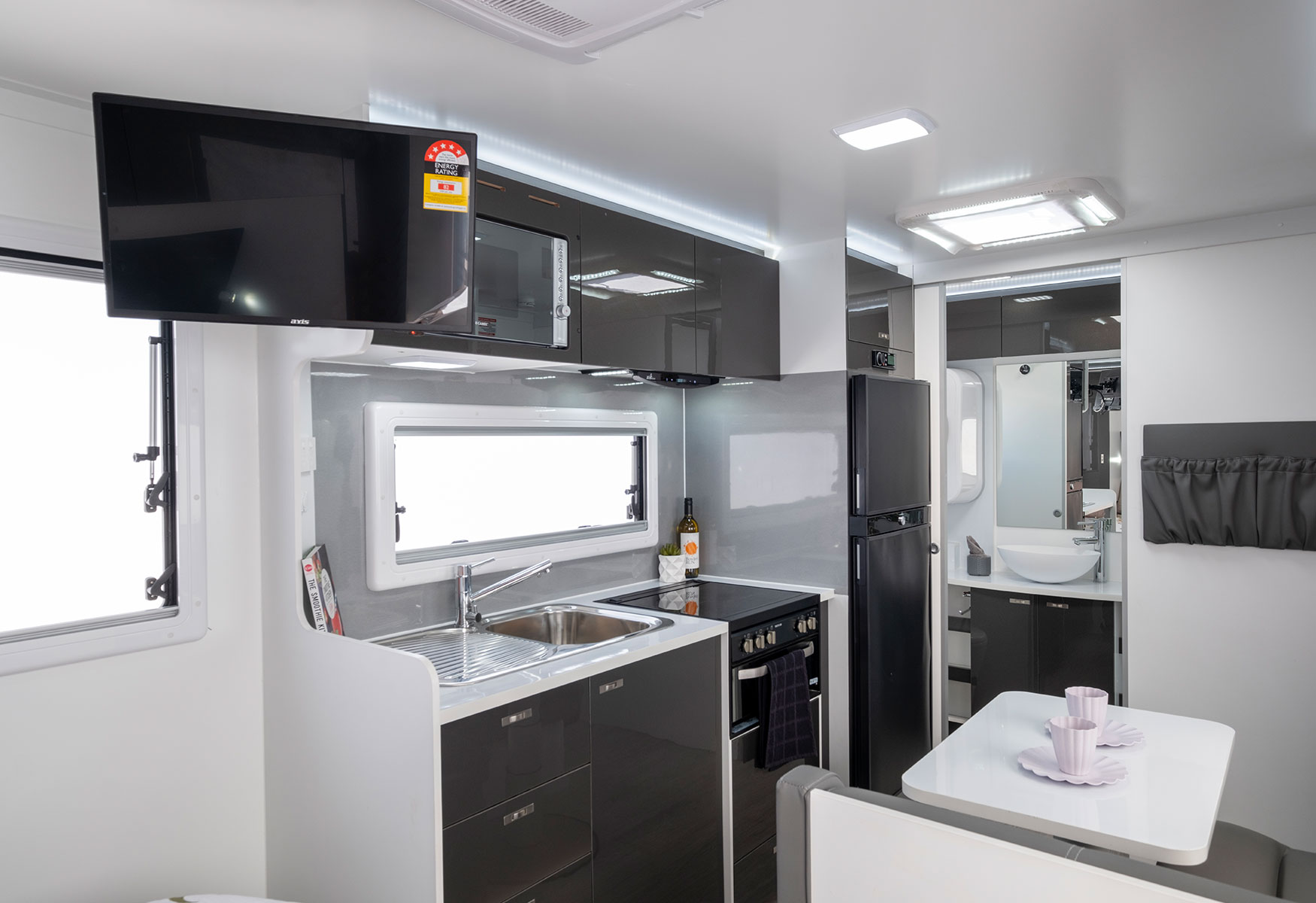 The Genesis interior is designed for functionality, comfort, and everyday touring, offering a spacious sleeping area with flexible family options and a well-appointed ensuite for added convenience. A modern kitchen makes meal prep easy, while the dining and lounge layouts create a relaxed space to unwind. Climate control, entertainment systems and clever inclusions like a washing machine help make longer trips feel effortless, inside, or out under the awning.